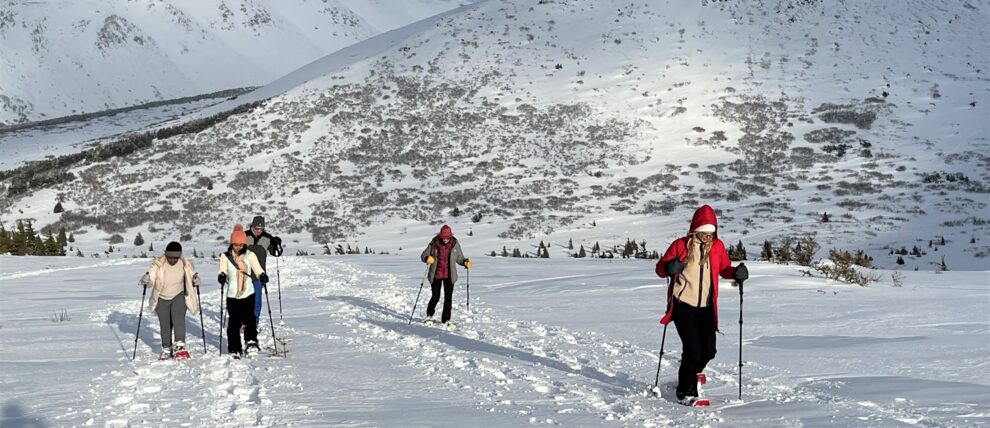The Winter Snowshoeing Adventure tour covers about 2.5 miles with 400 feet of elevation gain. The tour time includes an hour of travel and about two hours snowshoeing.